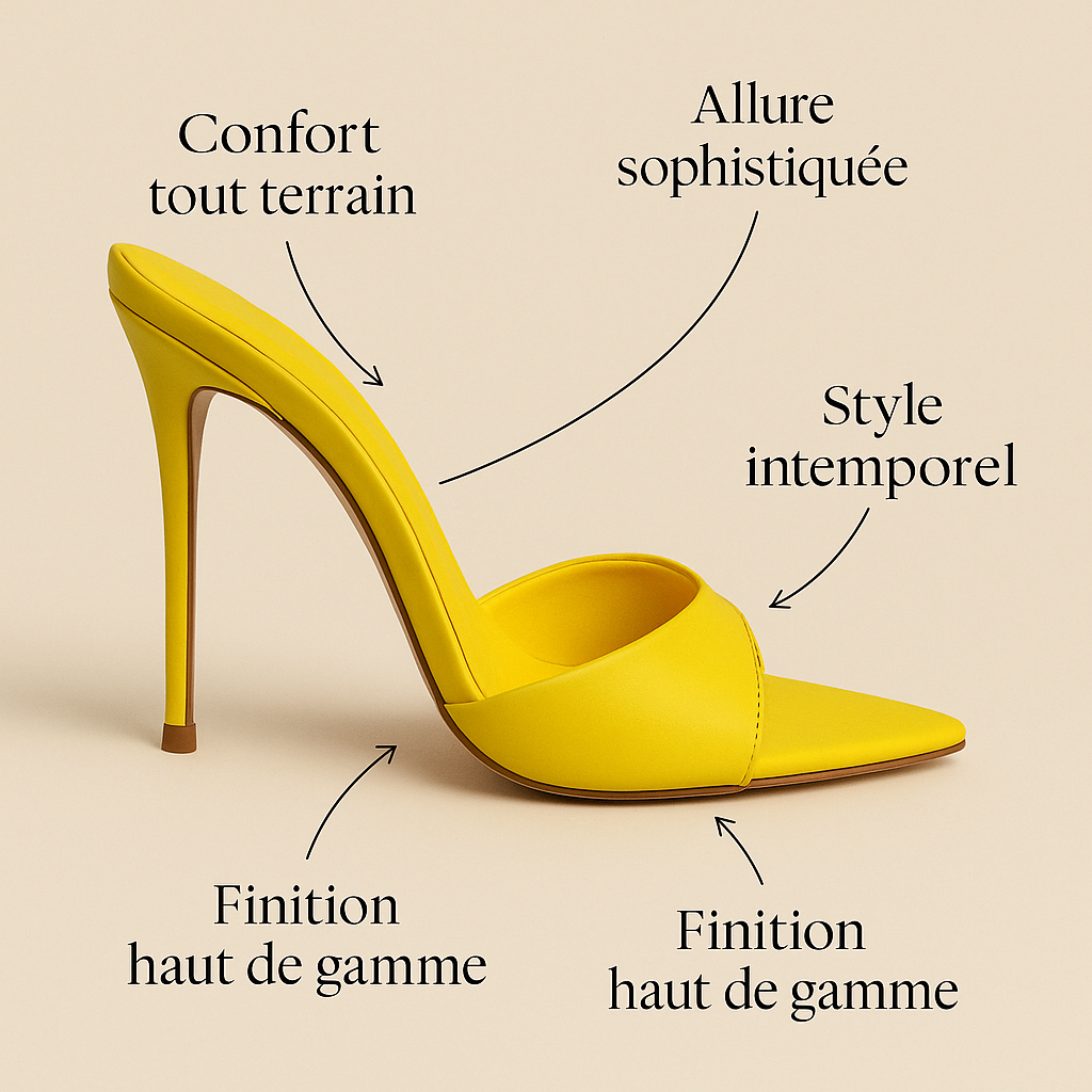 Talon Hauteur 5 cm Forme Plat avec plateforme invisible Style de marche Stable et naturel, parfait au quotidien Matière & finitions Matière principale Flock au toucher velours Aspect / texture Mat et doux, façon daim Finition du bout Bout ouvert et délicatement arrondi Coloris Jaune citron éclatant Où porter la paire Occasions idéales Garden-party, terrasse d’été, week-end chic Tenues recommandées Jean brut, robe fluide, ensemble lin Saison ou ambiance Printemps lumineux, été solaire