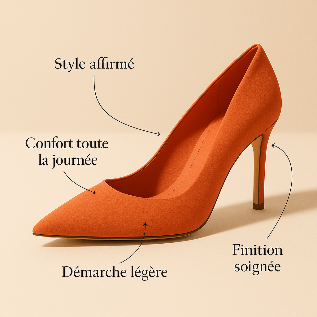Talon Hauteur 8 cm Forme Fines et élancées Style de marche Précise, confiante et féminine Matière & finitions Matière principale Daim Vegan haut de gamme Aspect / texture Visuel brut, toucher doux Finition du bout Pointu, ultra délicat Coloris Orange corail vibrant Où porter la paire Occasions idéales Soirée, dîner, événement chic Tenues recommandées Robe fluide, tailleur clair, jeans 7/8 ajusté Saison ou ambiance Printemps doux, automnes lumineux