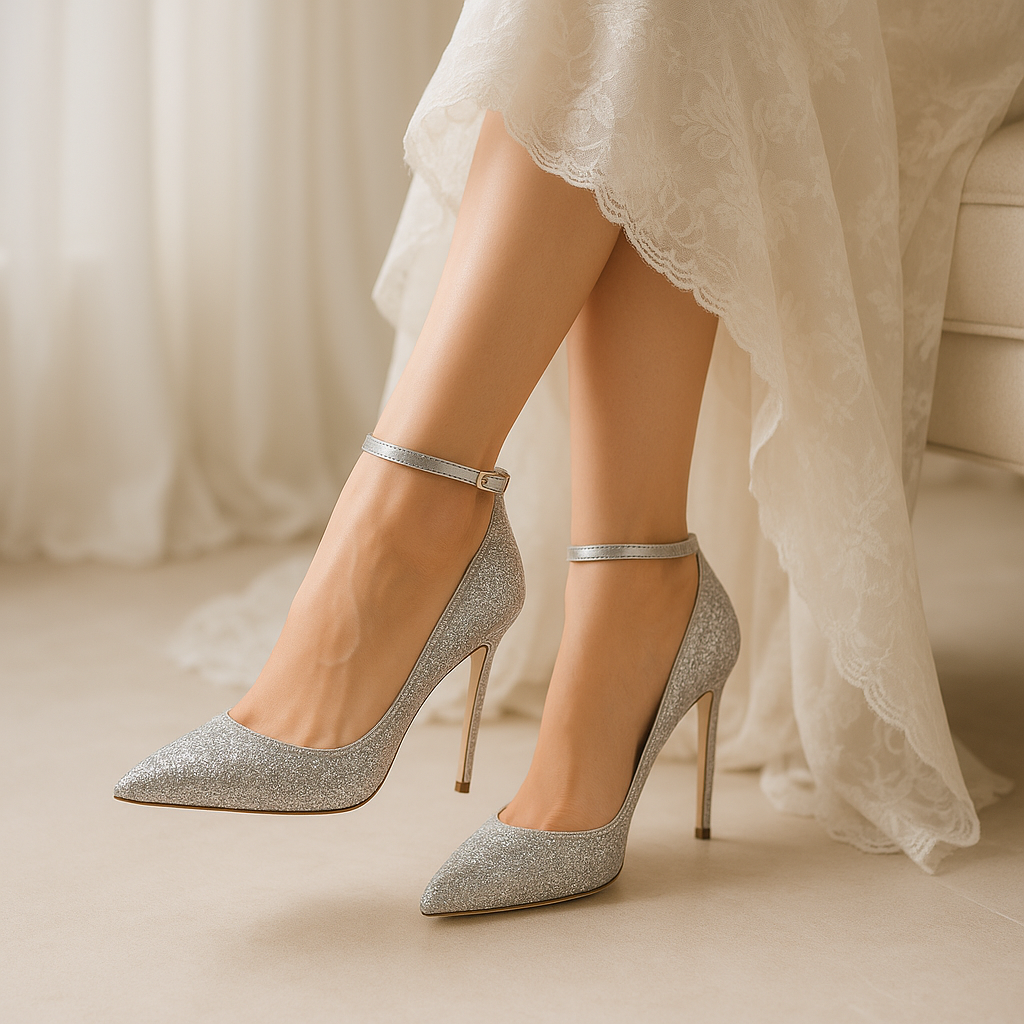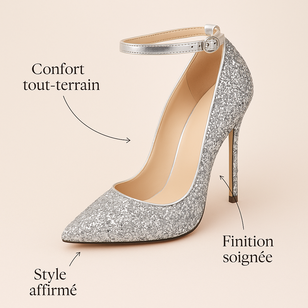 Talon Hauteur 16 cm Forme Stiletto fin Style de marche Assuré, élancé, ultra-féminin Matière & finitions Matière principale Cuir vegan & tissu sequins Aspect / texture Scintillant, luxueux, effet bijou Finition du bout Bout pointu raffiné Coloris Unis, éclats de lumière Où porter la paire Occasions idéales Mariage, gala romantique, soirée de prestige Tenues recommandées Robe fendue, costume ivoire, jupe plumetis Saison ou ambiance Printemps-été ou ambiance nocturne chic