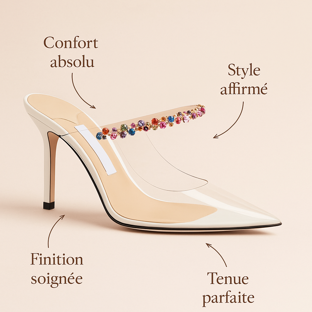 Talon Hauteur 7 cm Forme Fins et élancés Style de marche Sensuelle, aérienne et assurée Matière & finitions Matière principale PVC transparent Aspect / texture Lisse, cristal et seconde peau Finition du bout Fin, légèrement pointu pour allonger la ligne Coloris Blanc pur & effet nude Où porter la paire Occasions idéales Soirée chic, cocktail lumineux, mariage Tenues recommandées Robe fluide, tailleur blanc, combinaison élégante Saison ou ambiance Printemps-été, ambiance céleste et féminine